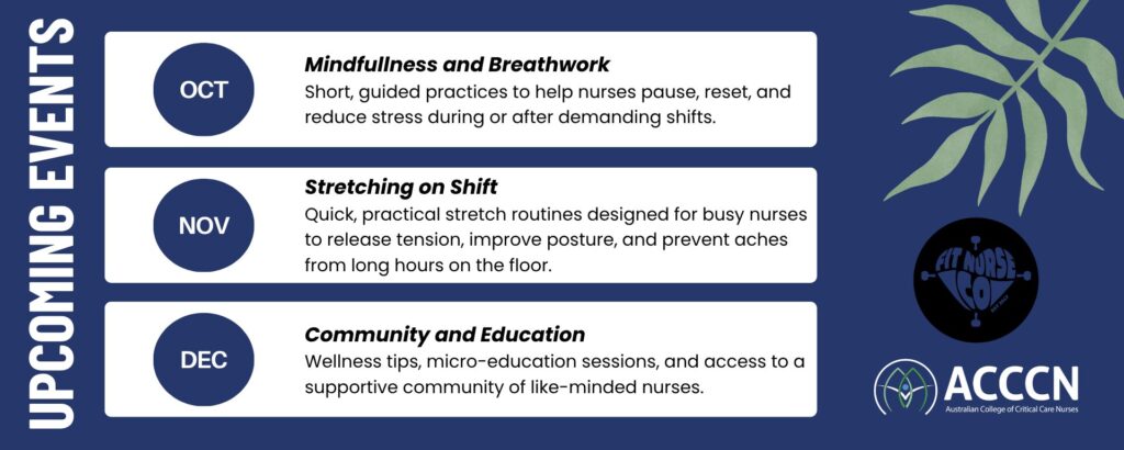 Join us each month as we spotlight practical, inspiring content to support the wellbeing of critical care nurses. Led by Nurul Norzahari Registered Nurse, Personal Trainer, and Lifestyle Coach from FitNurseCo, these videos offer expert tips on wellbeing and holistic health. Whether you’re on shift, off duty, or somewhere in between, this space is here to help you take a moment to recover, recuperate and fill your cup while navigating the demands of critical care nursing.
